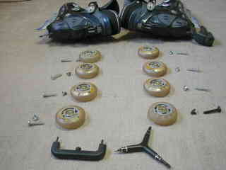 六角レンチや、メンテナンスツールの六角レンチで、 インラインからウィールを取り外します。 ROLLERBLADE社 e4.4は 左右2本の六角レンチ類が必要ですが、 インラインの種類によっては片側は固定されていて、 六角レンチ1本で取り外せるものもあるようです。 |