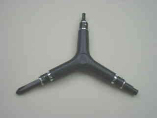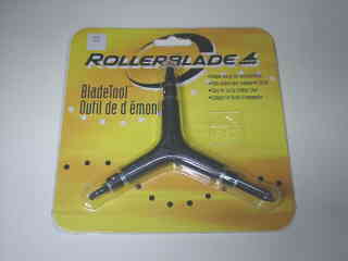 ROLLERBLADE社 「ブレードツール」 売価900円+消費税でした。 手裏剣型の形状で、 道具として使いやすい形。 3つの先端はそれぞれに 六画レンチ、ベアリングスペーサー、 プラスドライバーで構成されている。 |
